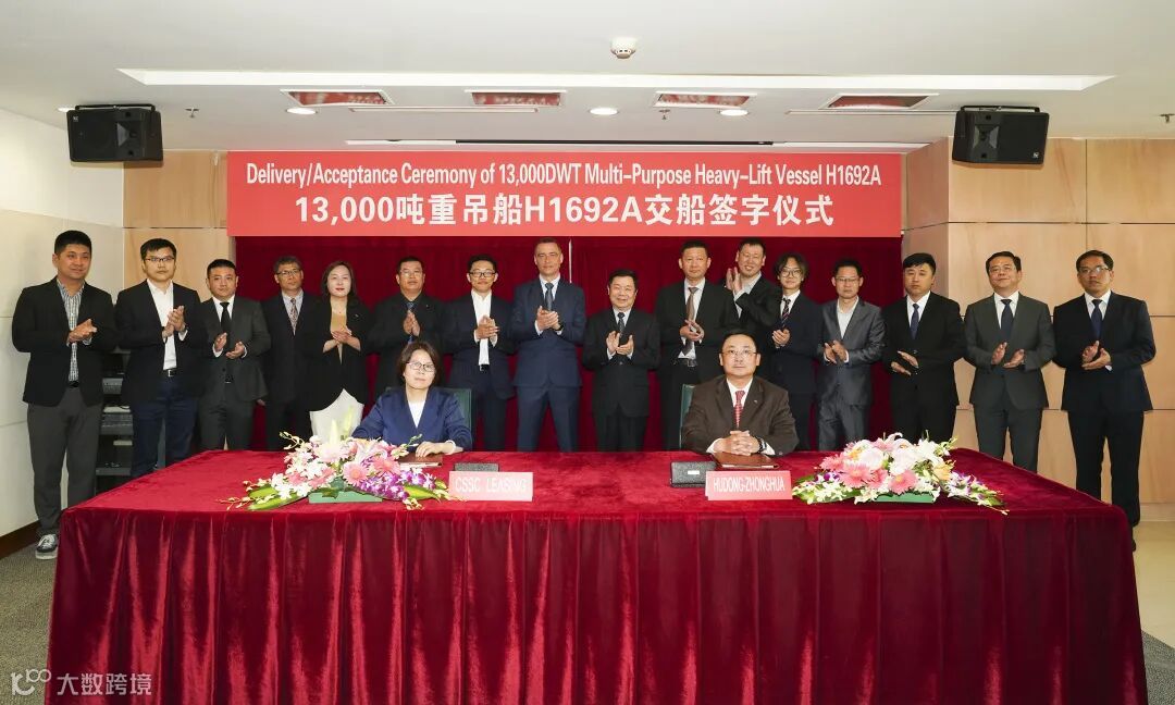 当天上午,在东华科技大厦举行优化型13000吨重吊船2号船(H1692A)交付签字仪式,中船租赁业务部副总经理张丽萍与沪东中华副总经理迟本斌签署交船文本,公司总经理陈军、军品副总建造师兼总装三部部长陆方东及配套部、质保部等部门负责人出席。