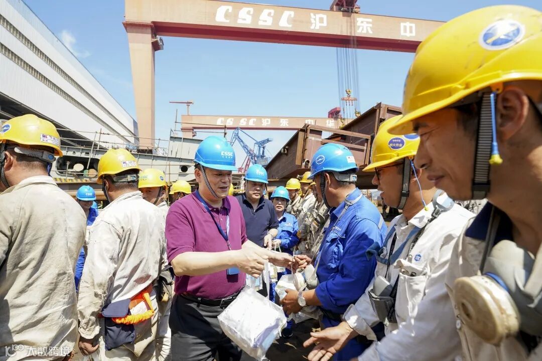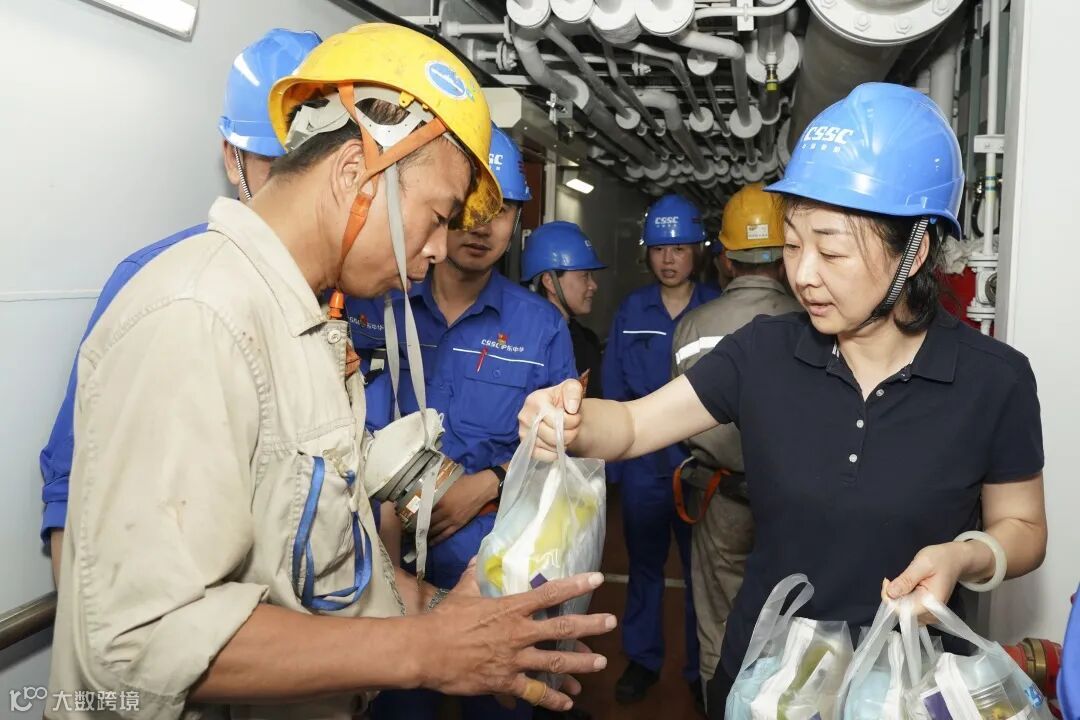 7月14日上午,上海船舶公司党委副书记、工会负责人顾奚一行在公司党委副书记、工会主席秦蓉,公司工会办公室、总装一部相关负责人陪同下,来到船坞生产区域和在建船舶上,为酷暑中坚守岗位的职工送去防暑降温物品,让奋战一线的职工在高温天气下感受到丝丝清凉。