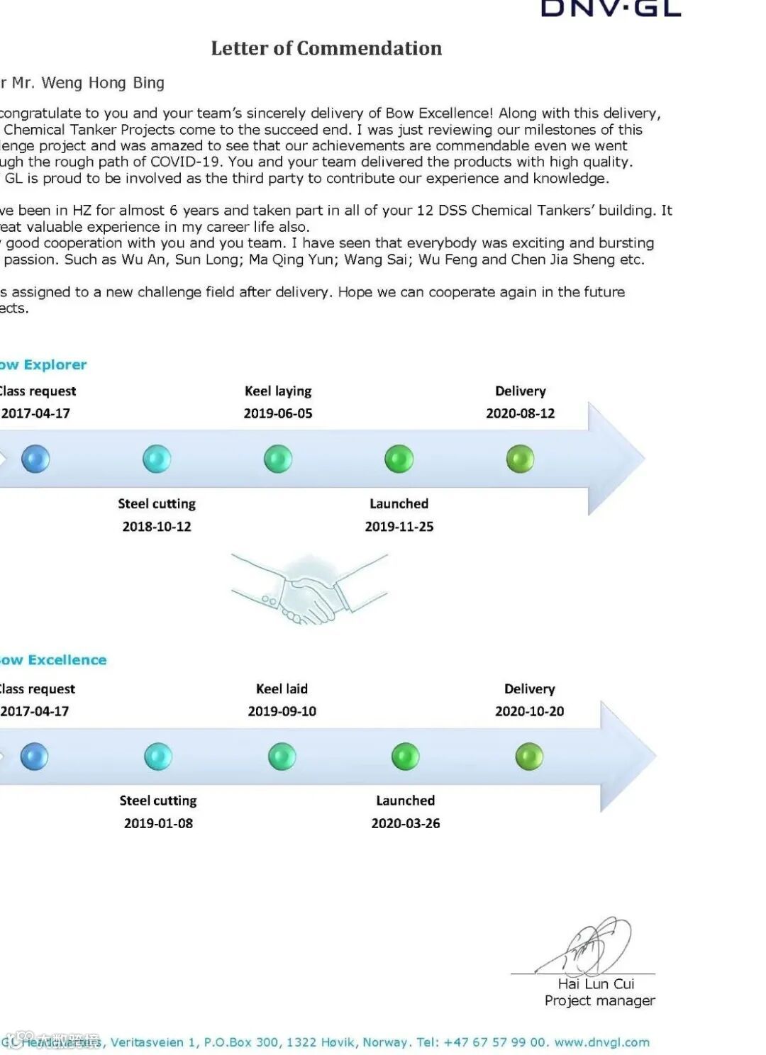 崔海伦先后参与我公司12艘化学品船监造检验工作,6年来见证了沪东中华一步一个脚印,化学品船建造水平取得巨大飞跃。他在信中表示:DNVGL船级社与沪东中华一直保持着良好的合作关系,化学品船项目组的高效工作令人印象深刻,沪东中华成功建造了2艘高质量船舶,DNVGL船级社作为系列船的检验方感到十分骄傲,祝贺沪东中华又一次取得了优异的建造成绩。