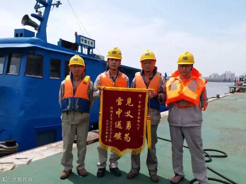 5月20日,浙桐乡货02033号船船主将一面印有“见义勇为,雪中送炭”的锦旗送至公司船运中心,表达对“中船七号”危急时刻施以援手的感激之情。