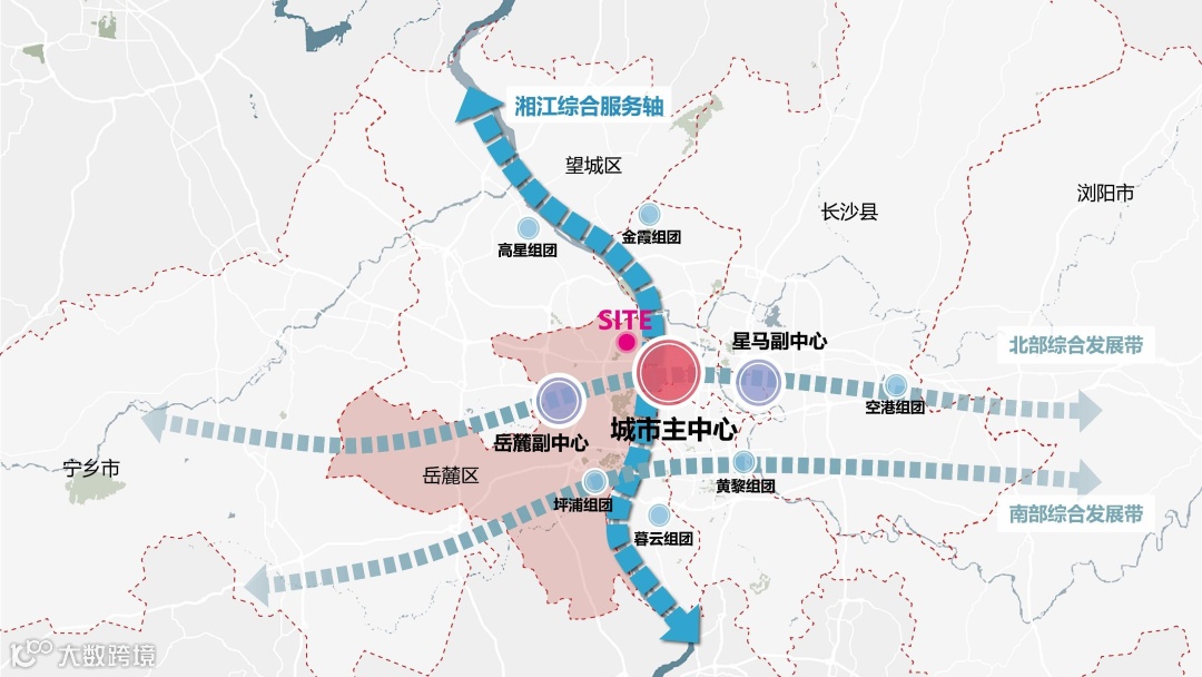 项目位于“一带一部”核心区域,用地东侧为城市次干道观沙路,引导南侧主城区人群为主要车流来向。南侧为城市次干道茶子山路,连接东西两侧的居住区,有较大的车流量。规划轨道交通10号线紧邻项目用地南侧,并于东南角有地铁站,为地下人流的主要来向。轨道交通8号线位于西侧,于西南侧约500m设置地铁站。