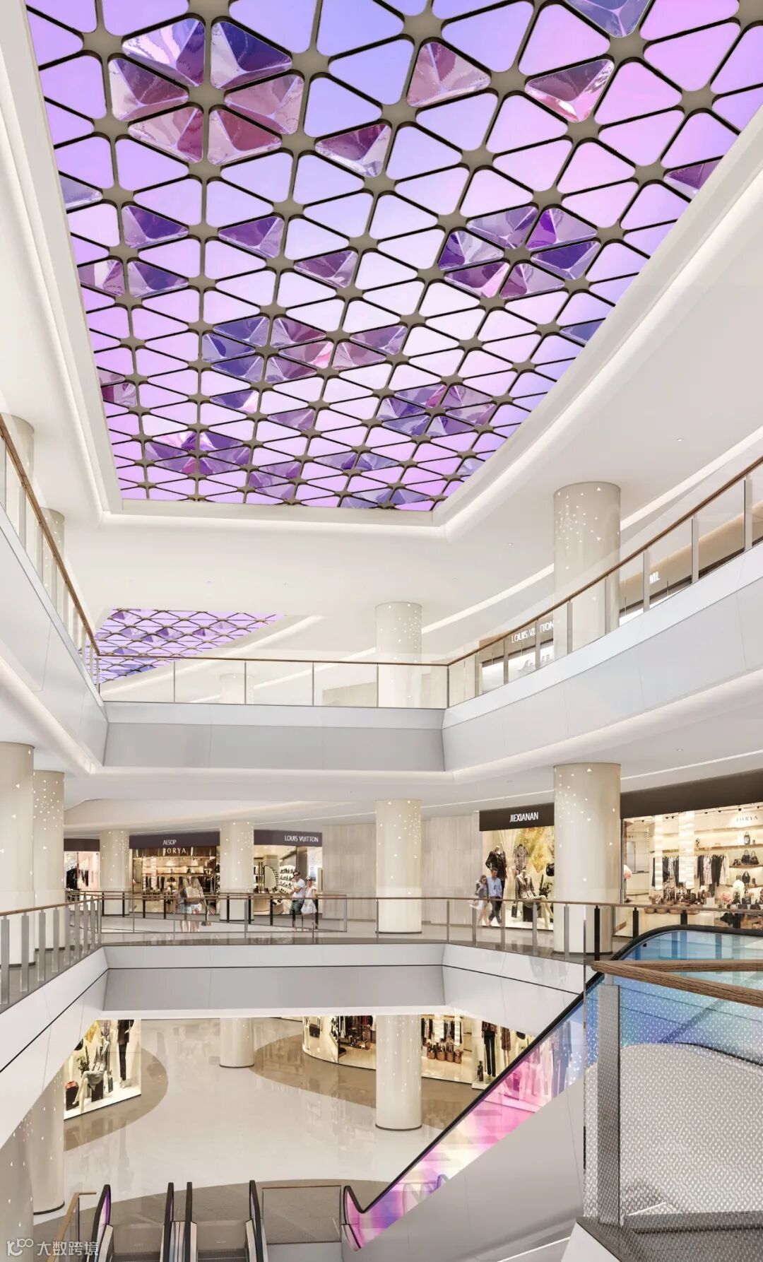 购物中心中部形成宏大的全明中庭效果,玻璃型穹顶延续荷花的色彩元素,有效利用灯光色彩,以光的变换打造轻盈、穿透的空间氛围,通过光与影的对比提升整个商业空间的艺术价值及趣味感;玻璃的穿透感将大量的天光引入,一定程度上减少光源使用。