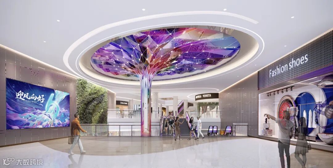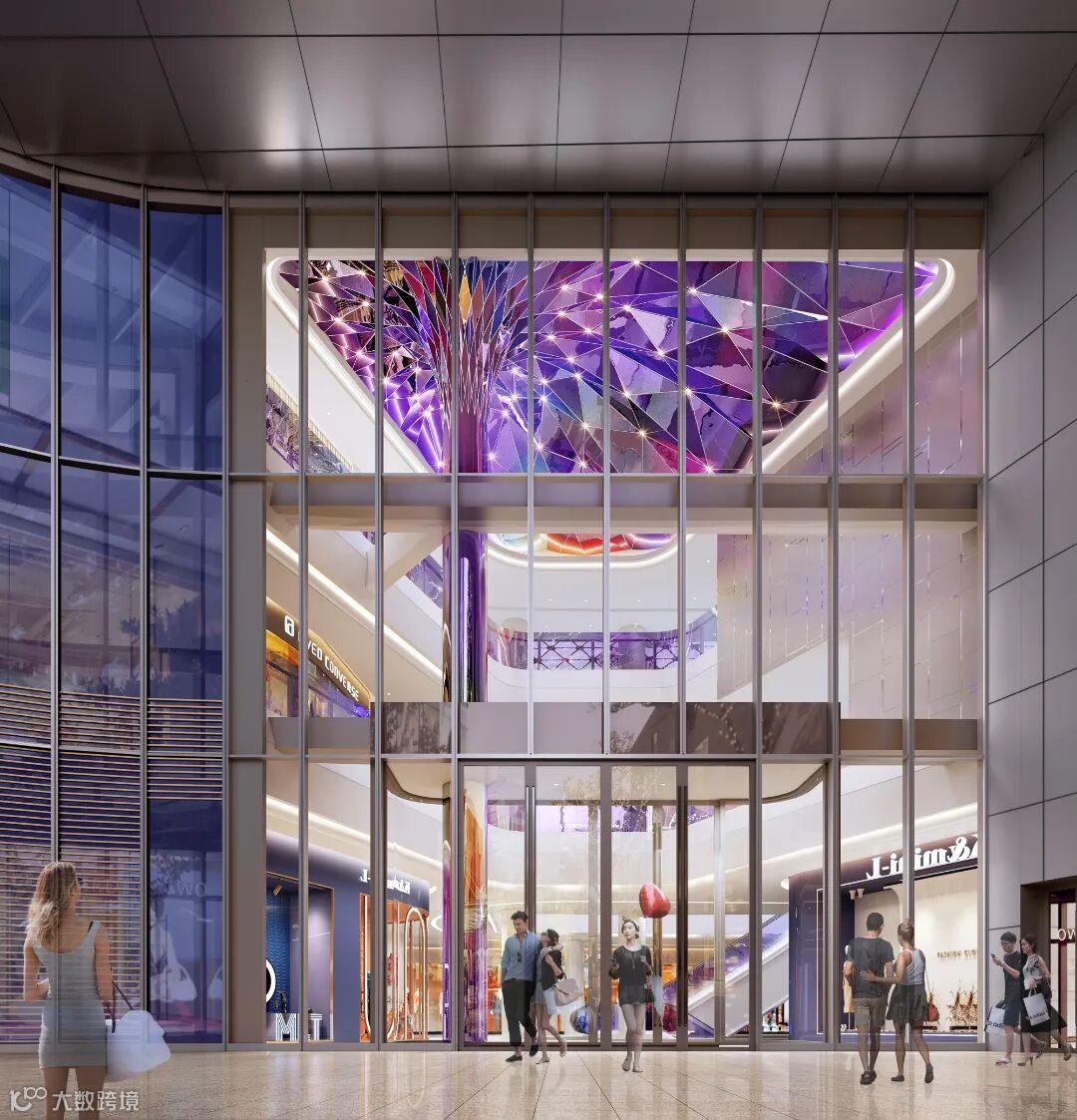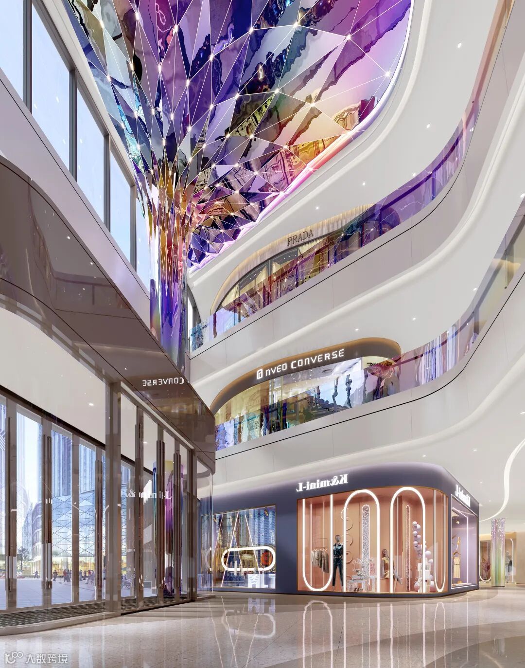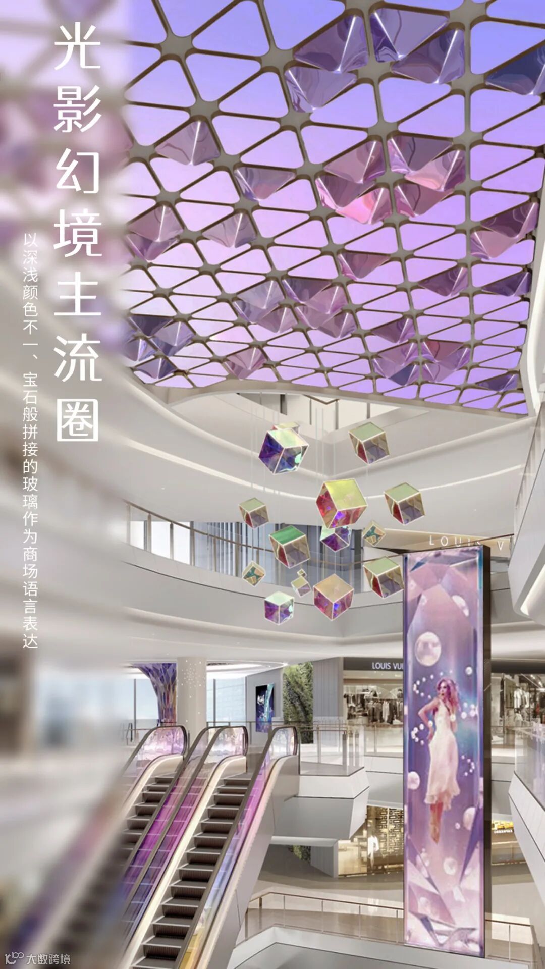 商业项目中情景空间与色彩的碰撞成为了人们情感寄托的载体。设计师将色彩融入商场入口区,取荷花寓意,用现代设计手法进行宝石般多面切割,以深浅颜色不一、宝石般拼接的玻璃作为商场语言表达,使用多种颜色、不同材质来体现色彩的多变属性,整个商场空间,因光而灵动。