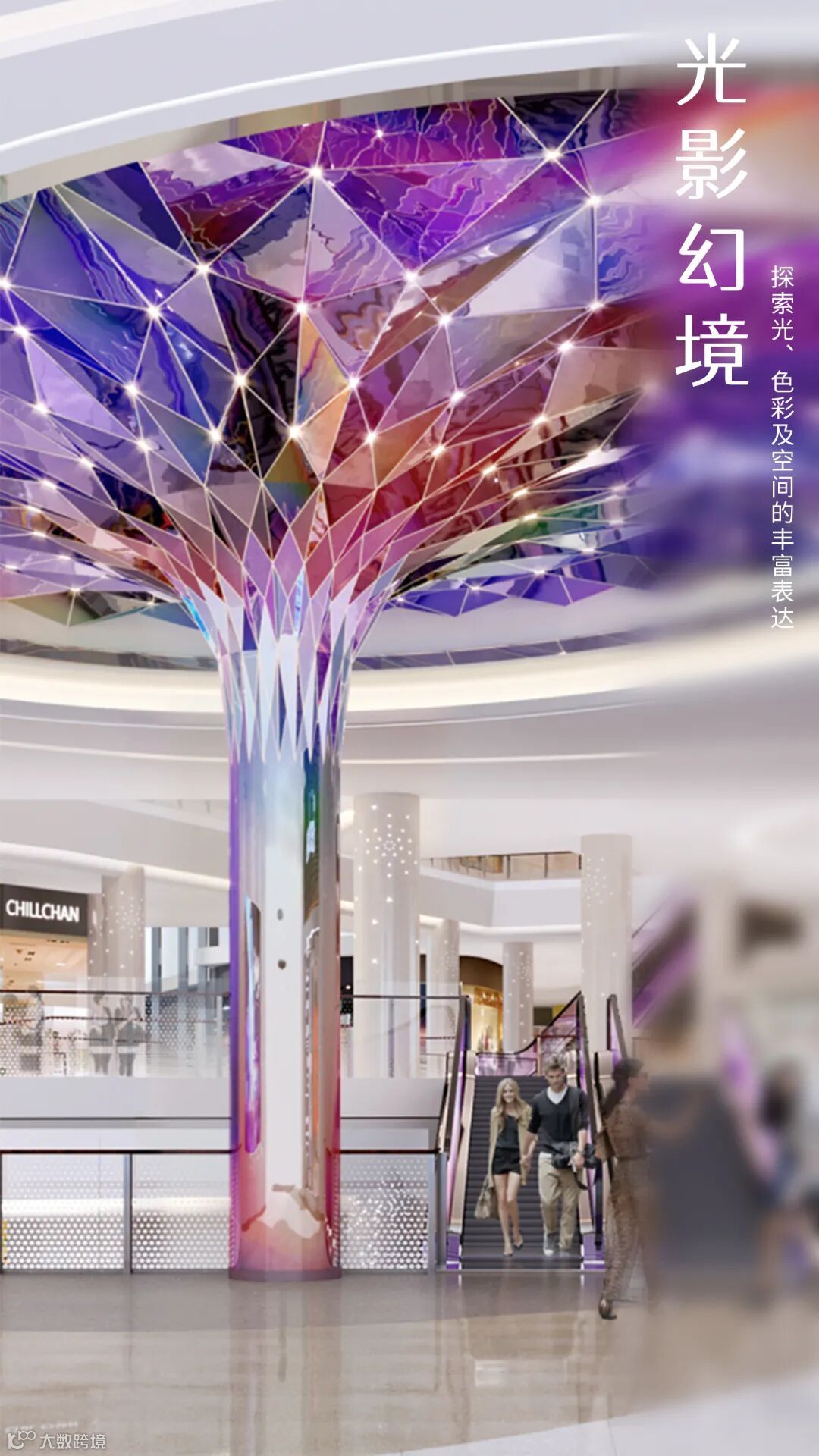 商场中心的艺术装置延续镜面切割设计,设计师致力于探索光、色彩及空间的丰富表达,通过镜面与“莲花”主题的结合,呈现奇妙的效果,仿佛在喧嚣的商业空间营造了一个“光影幻境”,让观者能够感知朦胧的边界。