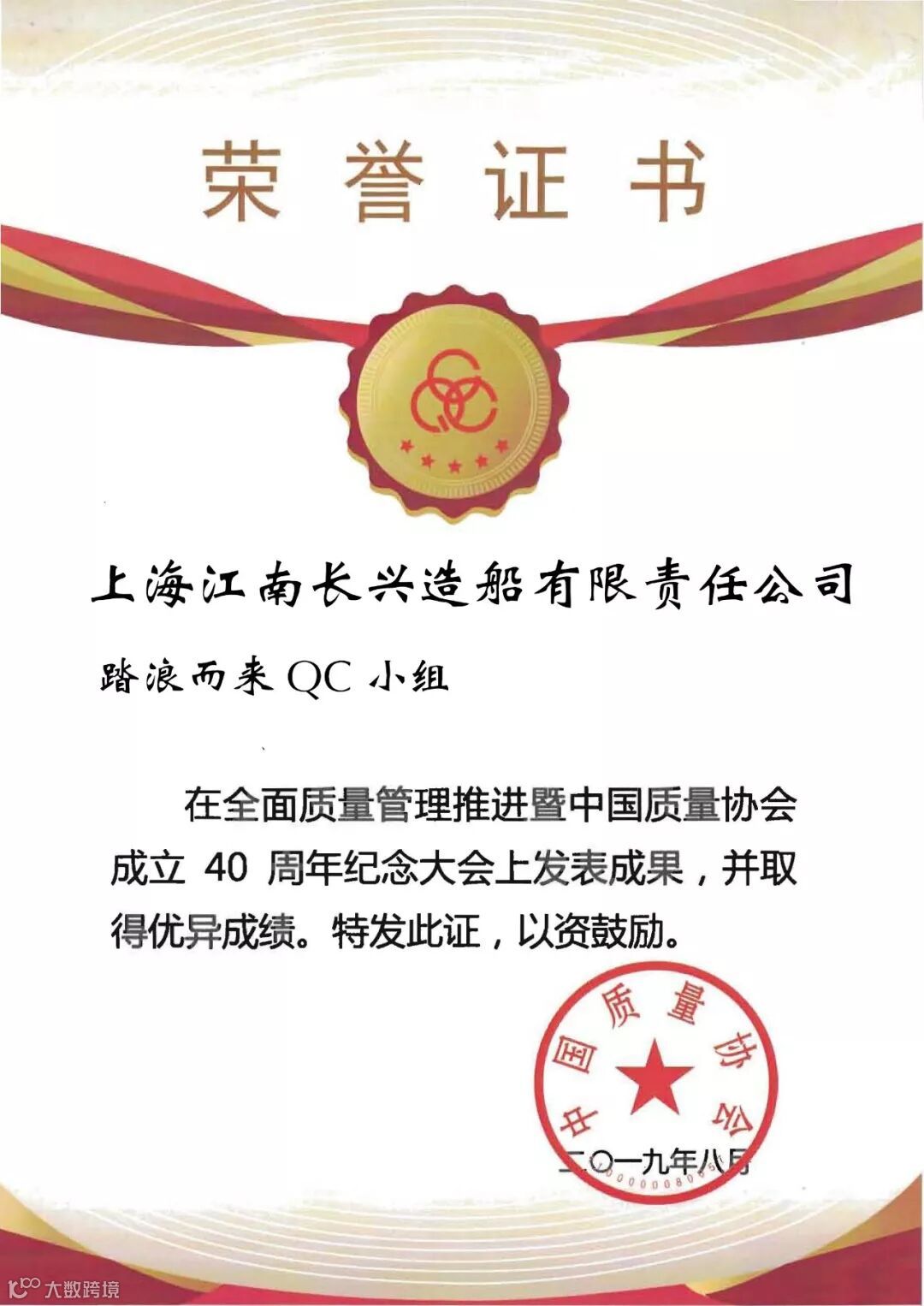 8月28-29日,全面质量管理推进暨中国质量协会成立40周年纪念大会在京隆重召开,沪东中华“踏浪而来QC小组”受中国质量协会邀请,代表中国船舶工业集团有限公司参加现场交流,在2019年度全国优秀质量管理小组的课题中脱颖而出,以优异的成绩摘得国优中的“金奖”。