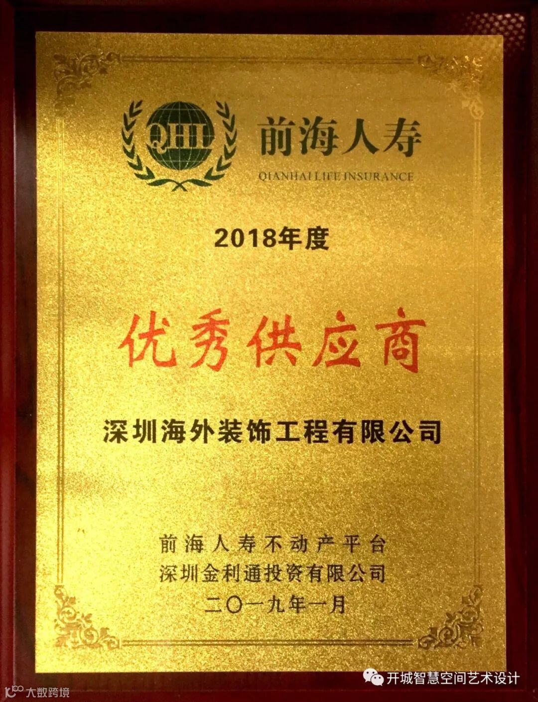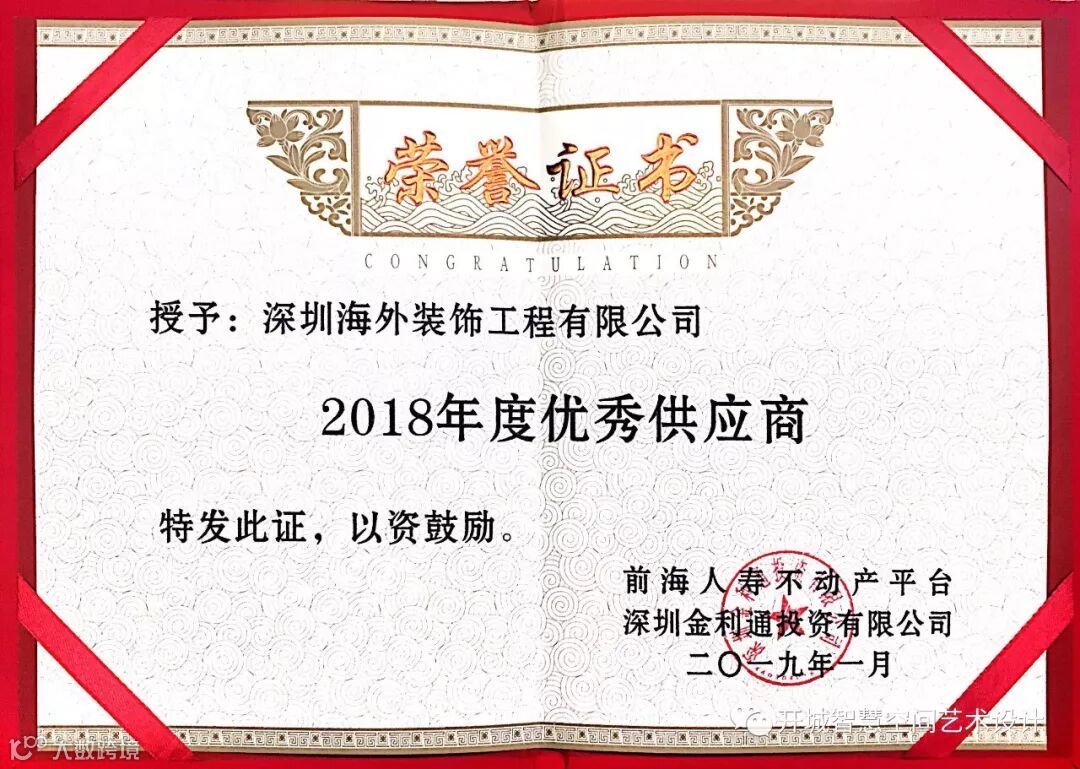 荣获“2018年度优秀供应商”奖项是宝能集团前海人寿不动产平台对深圳海外装饰工程有限公司的肯定和认可,更是对未来不断携手共同打造精品工程的憧憬。作为前海人寿不动产平台的战略合作伙伴,我司一直致力于为客户提供更优质的服务,为投资方提供项目总体的策划、定位和项目设计、软装配饰、灯光设计、家私设计等一站式专业服务。