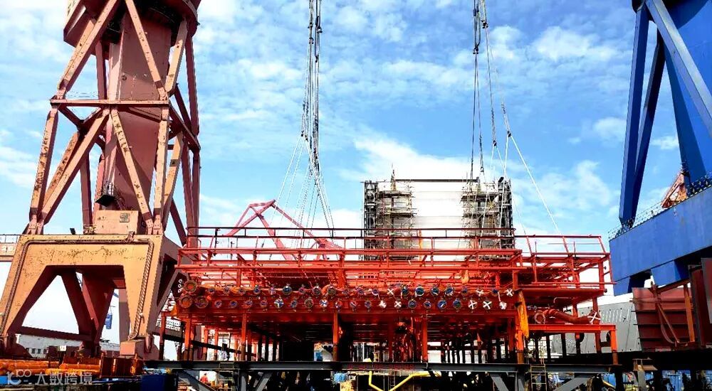 9月18日,49000吨化学品船首制船集管区最大甲板单元UD401成功吊装上船。