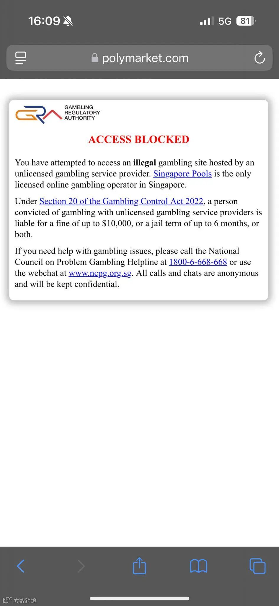 Cobo Global 投资及托管副总裁 Alex Zuo在 X 上发文:“Polymarket 在新加坡被官方定义为赌博网站,如果你想下注,只能去国有赌博公司,否则会面临罚款和监禁。”