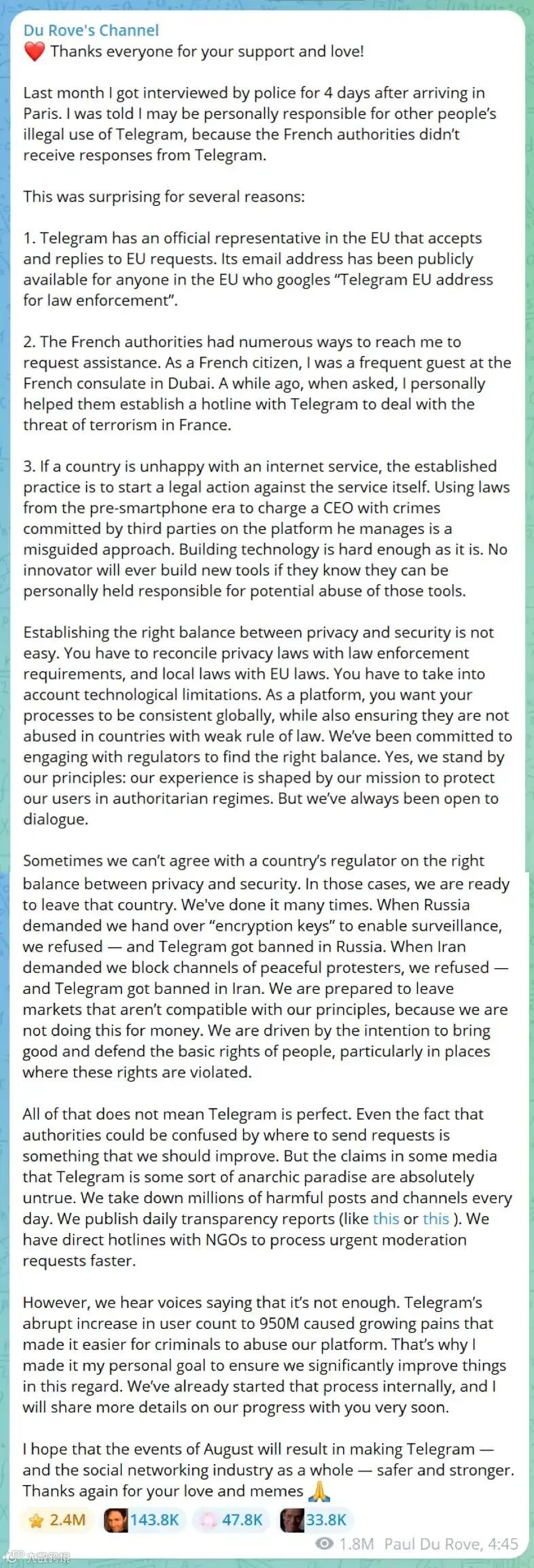法国当局有多种方式可以联系到他:杜罗夫作为法国公民,表示他经常前往迪拜的法国领事馆,之前他还亲自协助法国与Telegram建立了热线,以应对恐怖主义威胁。因此,他认为法国当局完全有能力在需要时与他取得联系。 -