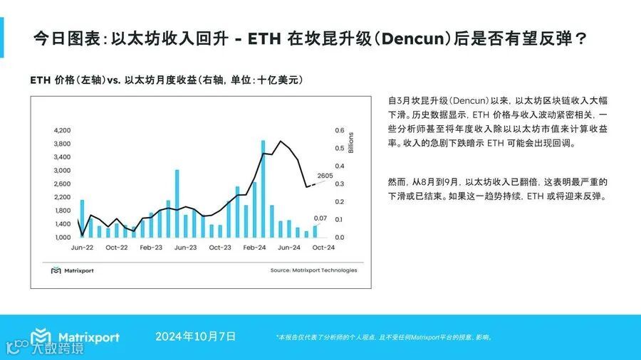 10月7日,Matrixport发推文表示,自3月坎昆升级(Dencun)以来,以太坊区块链收入大幅下滑。