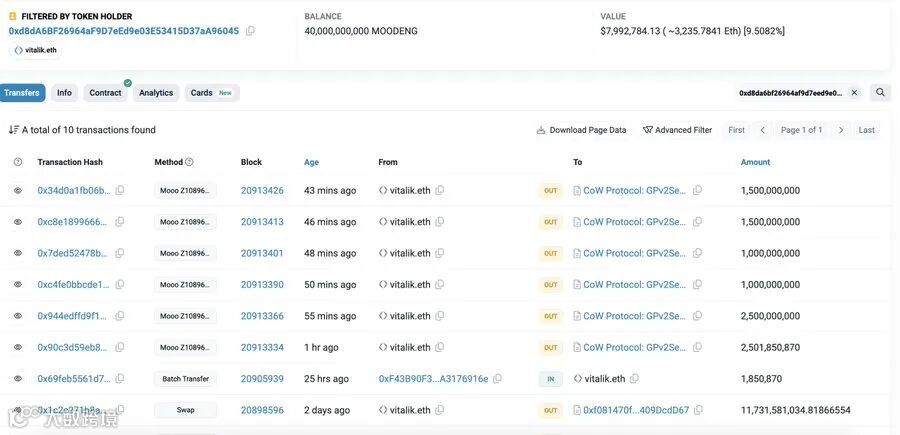 Vitalik出售100亿枚MOODENG换得308.69枚ETH