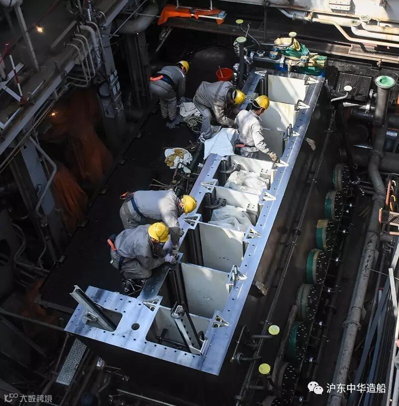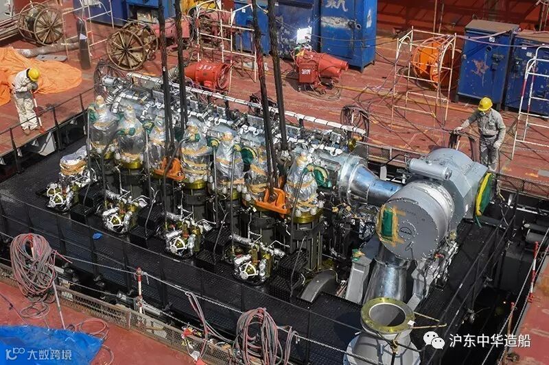 该船主机净重209吨,受船台吊车起重能力限制,总装三部将主机拆分为“汽缸体总成”、“机座机架总成”两大部分及若干散件吊装。