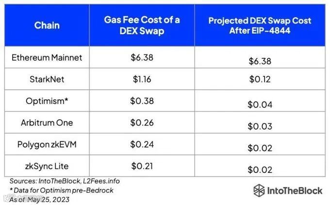 这对于以太坊生态系统来说将是一个巨大的胜利,预计将使 L2 交易费用大幅降低。如下图升级前后,交易费与原来相比便宜好多倍。