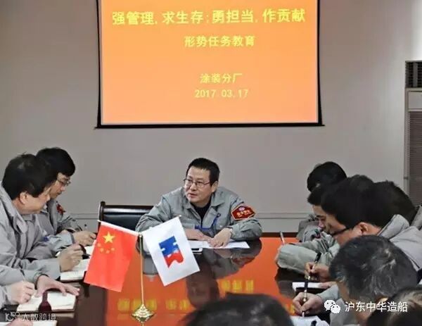 3月中旬至今,公司总助以上领导在设计、生产部门及各投资企业开展了20多场“强管理、求生存、勇担当、作贡献”形势任务教育宣讲活动,深入传达中船集团2017年工作会议精神和党建工作会议精神,深刻分析市场极为严峻的形势,明确公司2017年方针目标和六项重点工作,为干部职工、劳务工明责任、提士气、树信心。