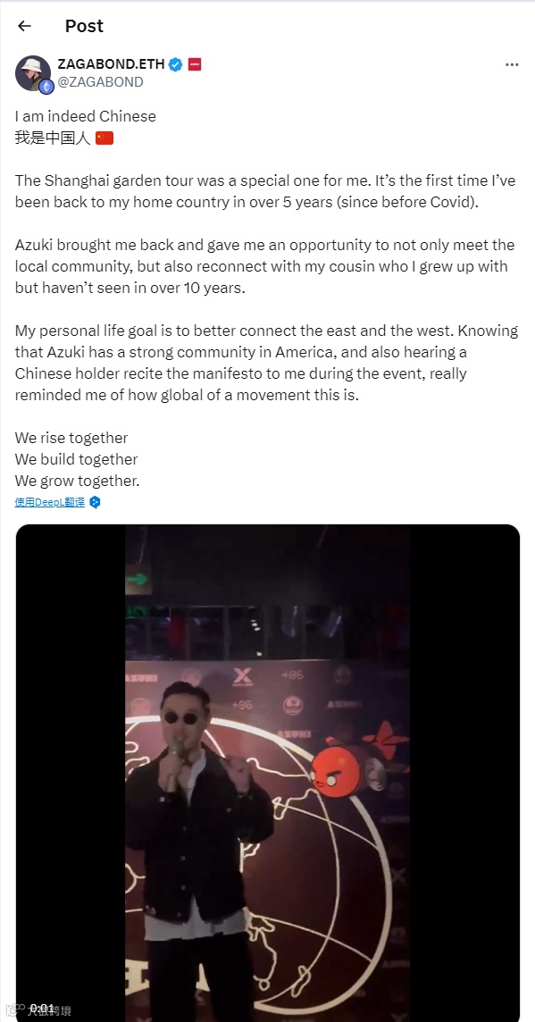 3月23日,Azuki 创始人 Zagabond 在 X 平台表示自己是中国人,出生于哈尔滨。自称这是五年多以来第一次回到自己的祖国(自新冠疫情爆发之前),个人的人生目标是更好地连接东西方。