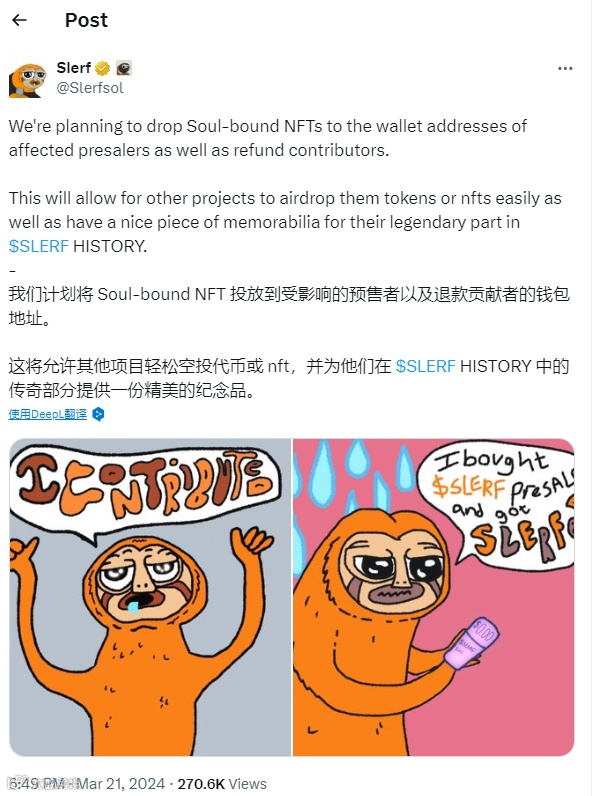 3月21日,Meme项目SLERF的创始人@Slerfsol在X平台发文称,将通过LBank交易所开始为Slerf预售受影响的用户发送第一批退款。