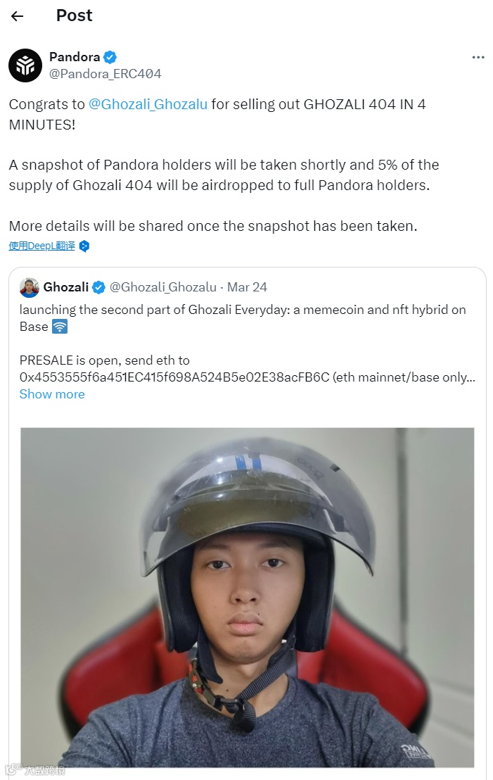Pandora:将向Pandora持有者空投5%的Ghozali 404