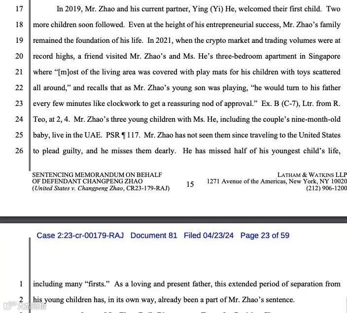 现在,赵长鹏与何一的三个年幼的孩子(其中一个仅有9个月大)都住在阿联酋,赵长鹏到美国认罪后就再也没有见过他们,也非常想念他们。赵长鹏律师团队在量刑备忘录中称,赵长鹏已经错过了他最小孩子生命的一半时光,“作为一个充满爱心的父亲,这种与年幼孩子长期分离状况,已经成为赵长鹏生活的一部分。”