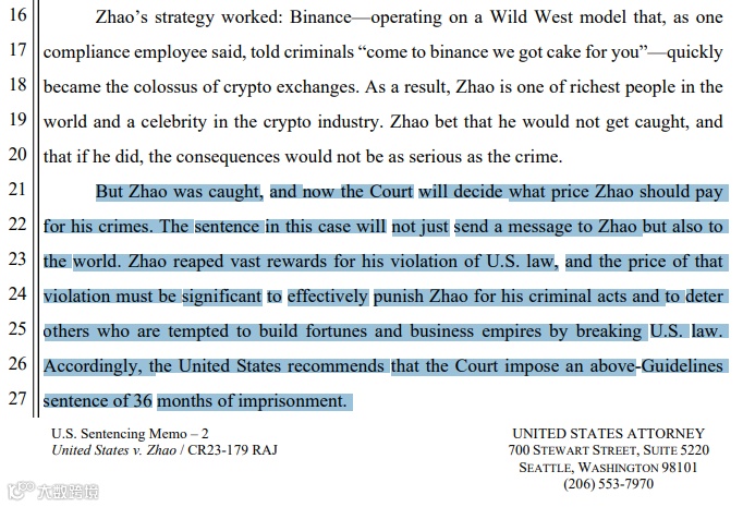 “此案的判决不仅向赵长鹏发出一个信号,也是在向全世界发出一个信号,赵长鹏违反美国法律而获得巨额回报,这种违法行为的代价必须是巨大的,才能有效惩罚赵的犯罪行为,并阻止其他试图通过违反美国法律来建立财富和商业帝国的人。因此,建议法院判处高于准则的36个月监禁。”
