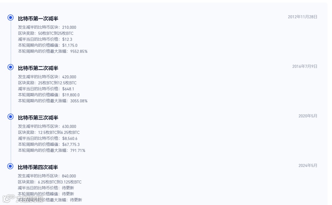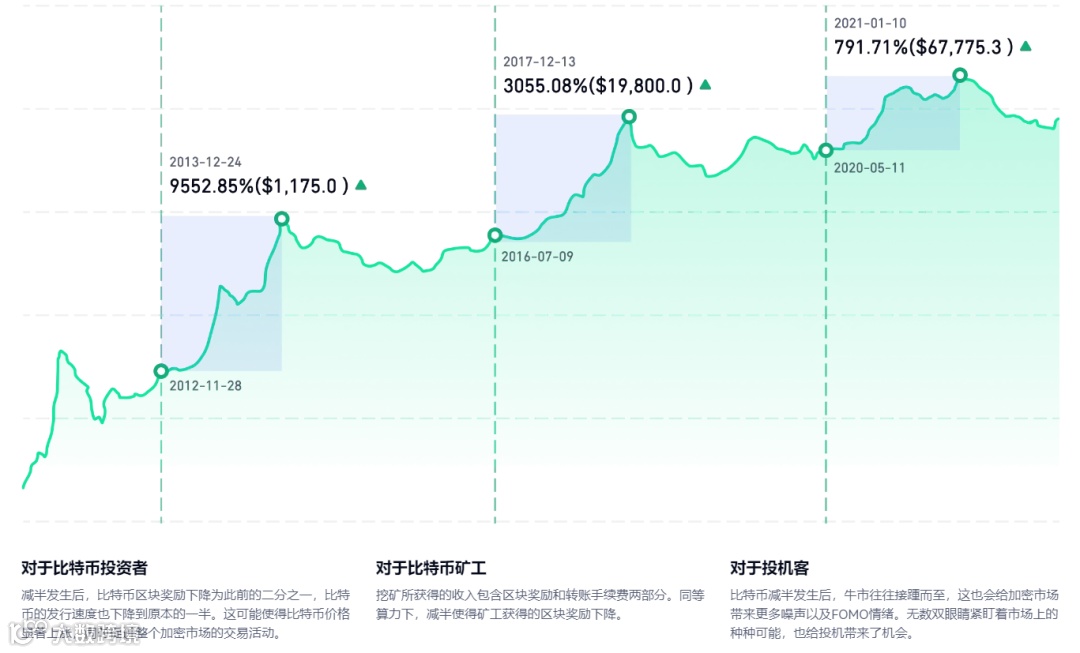 减半事件都与整个加密市场的牛市周期密切相关。历史上,每次减半发生后,比特币价格都在6到12个月迅速上涨,并抵达历史新高。