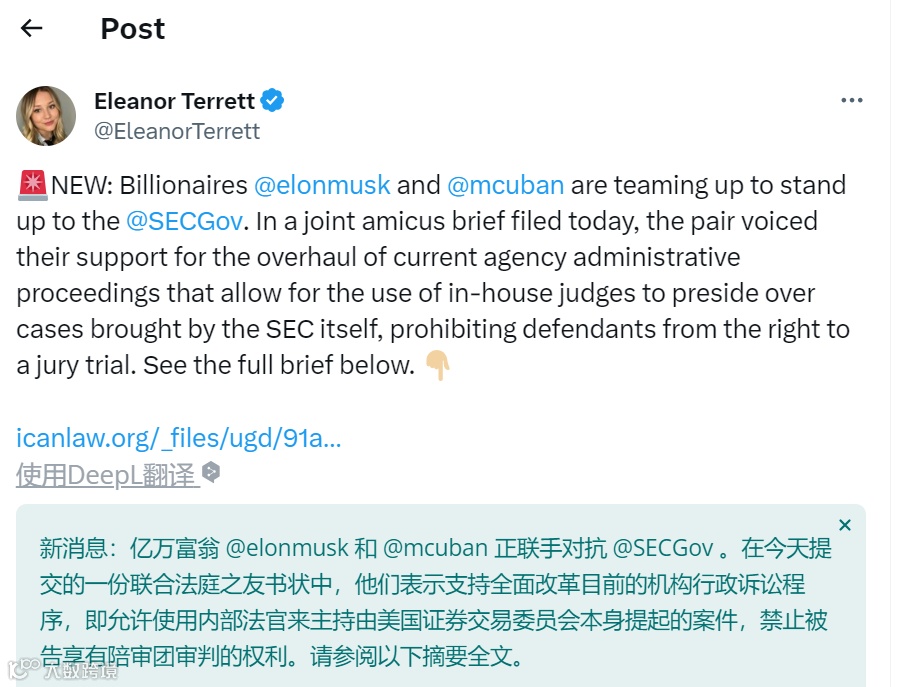 马斯克和Mark Cuban联手对抗美国SEC,要求彻底改革其行政程序
