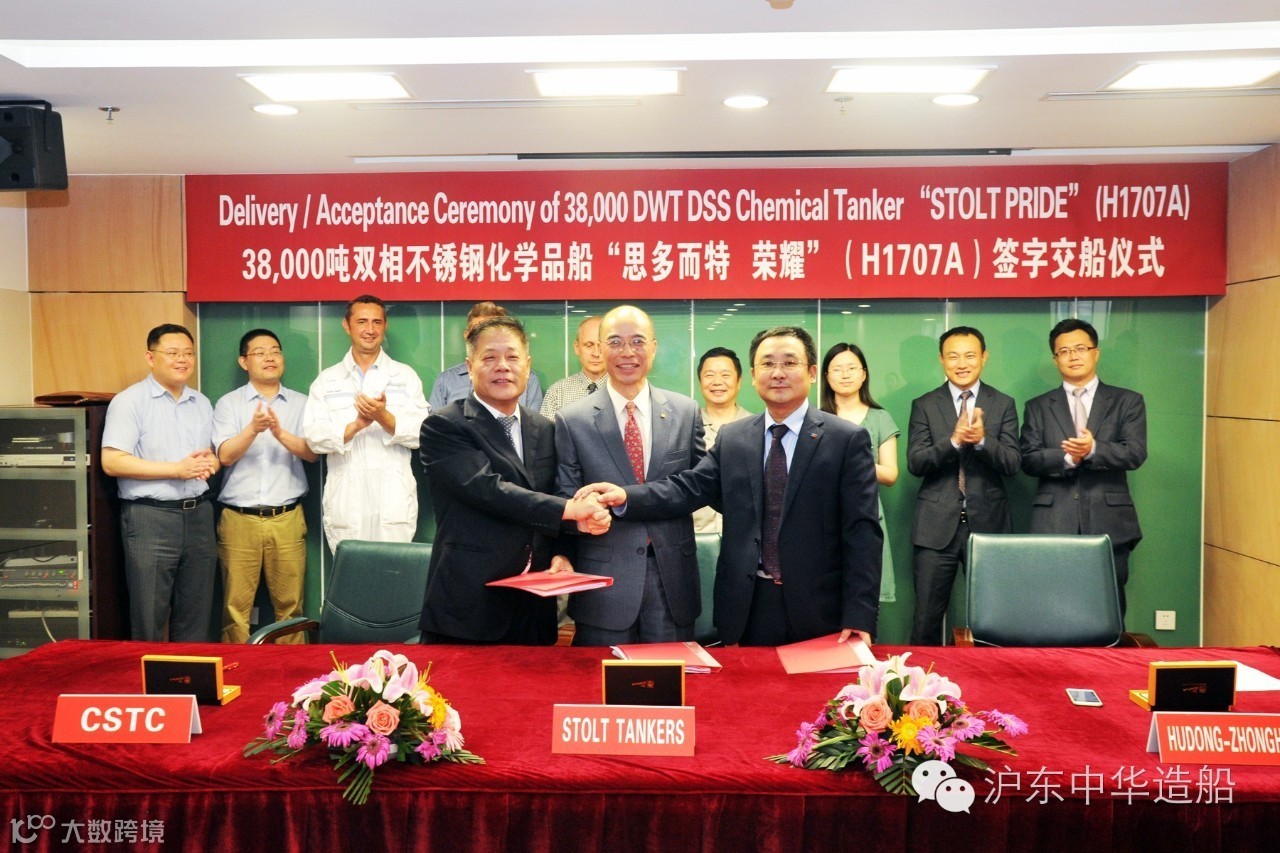 7月26日,38000 吨双相不锈钢化学品船“思多而特荣耀”号带着中国“智”造的“荣耀”扬帆起航。公司于7月22日为这艘集全球众多领先技术于一身的化学品船举行交船签字仪式。思多而特运输(上海)公司总经理瞿敏蔚、CSTC贸易公司业务六部顾问王燕中、公司副总经理迟本斌分别代表三方签署交船文本。船东方监造组组长Thomas Boodh、公司总经理陈军等领导出席仪式。