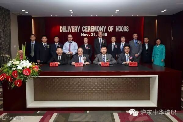 11月21日,由沪东中华为中民国际融资租赁股份有限公司(简称“中民投租赁”)建造的9400箱集装箱船“可丽”号签字仪式在长兴造船举行。中民投租赁船舶租赁部董事总经理刘华、瑞士地中海航运公司中国区新造船经理朱塞佩·加奎罗、中国船舶工业贸易公司副总经理林峰以及沪东中华常务副总经理黄一平共同签署交船文本。