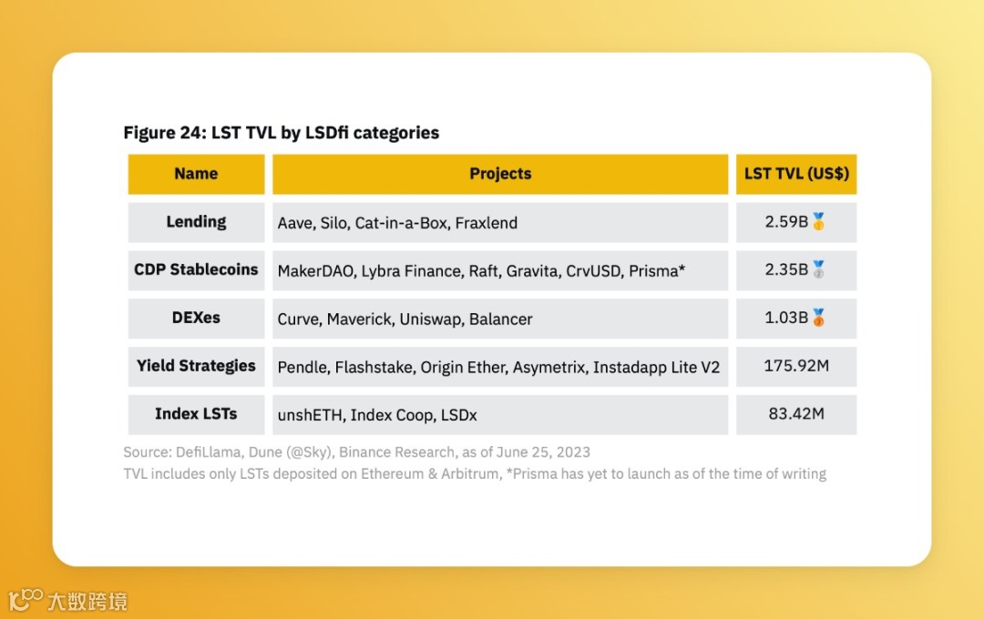 总之,LSDfi 领域正在迅速发展,并涌现出许多引人注目的项目和协议。从流动性质押到借贷、DEX 和收益策略,不同类别都各自拥有领先者和创新者。