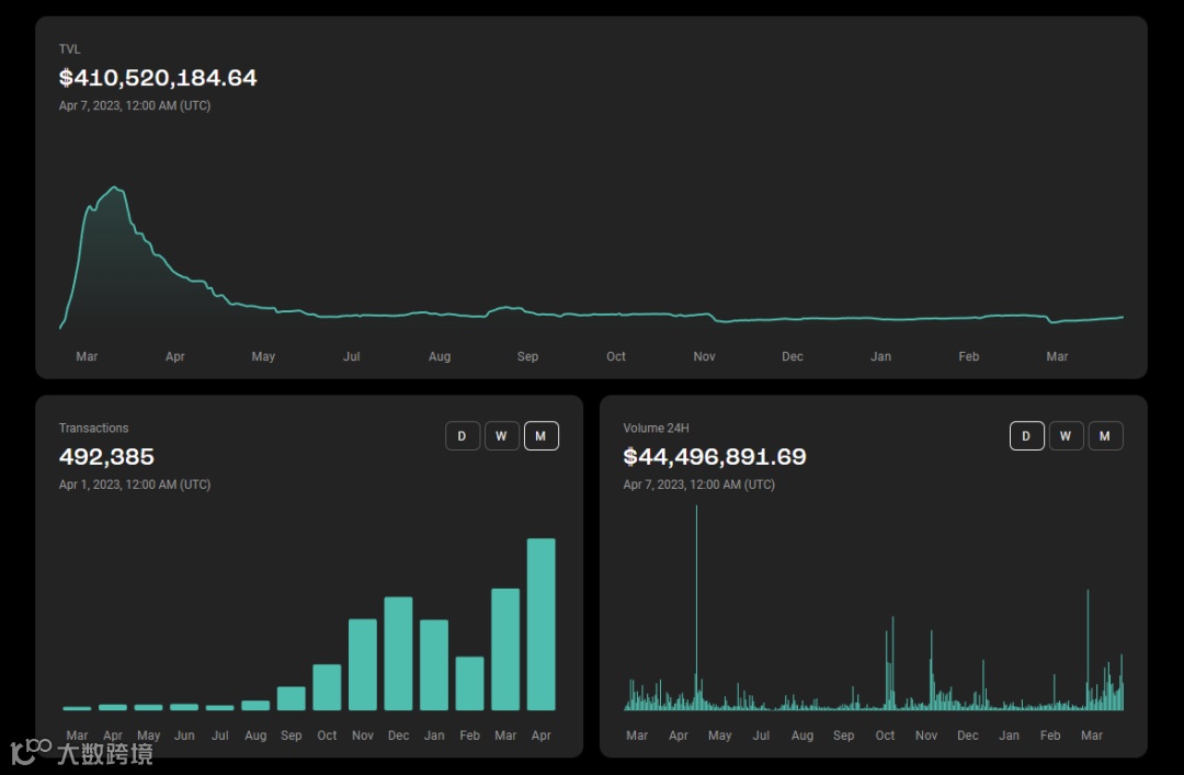 甚至知名交易所Sushiswap也采用了该协议。与DEX相似,Stargate也开启了流动性挖矿服务。值得一提的是,在Stargate跨不同链转移资产时只需要支付原链上资金,比如在以太坊使用USDT兑换Arbitrum的USDC,只需要支付以太坊即可,省时又省力。至今,Stargate已经处理了超过100万笔交易,资金已经突破了45亿美元。单是四月,其链上交易就突破了50万笔,链上锁定资金超过了4亿美元。