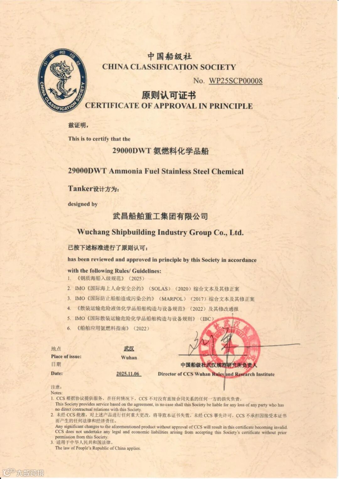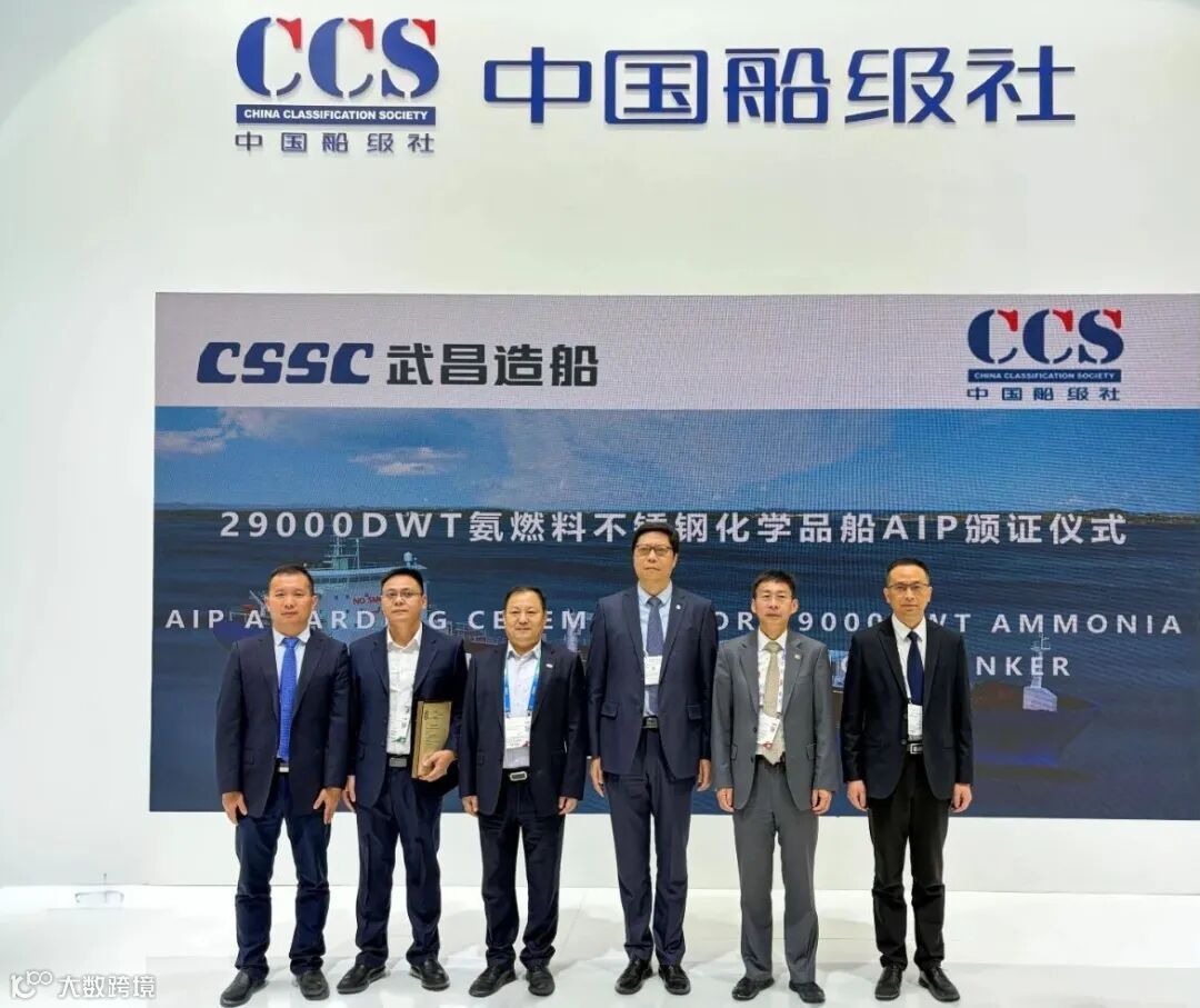 12月4日,在2025年中国国际海事展览会上,由中船集团武昌造船自主研发的29000DWT氨燃料双相不锈钢化学品船,成功获得中国船级社(CCS)颁发的原则性认可证书(AIP)。这一重要成果,标志着自主研发的零碳排放化学品船正式通过权威认证,为航运业绿色转型注入强劲动力。