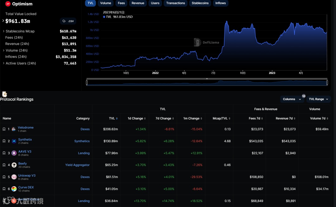 链上的应用(Dapp)是决定用户去留的关键因素,从图中我们可以看出Optimism 上排名前五的 DApps 是不同类型的,更加多元化,有去中心化交易所、衍生品、借贷等等。其中排名第一的是去中心化交易所Velodrome,它的TVL(锁定总价值)为2亿美元,昨日一天的活跃用户数量为871