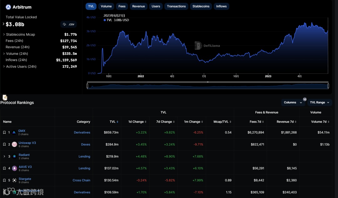 现在我们来看一下 Arbitrum,Arbitrum上火爆的Dapps有GMX、Uniswap V3、Radiant、AAVE V3,其中Radiant、AAVE V3都属于借贷平台,排名第一为衍生品交易平台GMX,其TVL8亿美元,昨日一天的活跃用户数量为2540