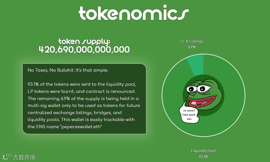 $PEPE官网显示,其代币发行总量为420万亿枚,其中6.9%的数量会存在公开的多签钱包中,用于上中心化交易所,剩下的代币会全部存入流动性交易池中,甚至还销毁了LP代币。