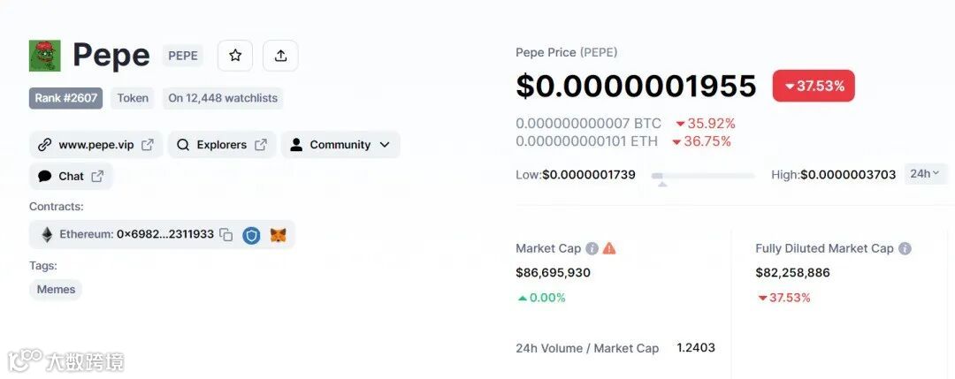 但不论如何,迷因币始终不能为用户带来任何实际权益。如果是为了表达情怀,似乎入手一点娱乐娱乐也无妨。但要是真想靠PEPE投资赚收益,那还是劝君谨慎。毕竟从Coinmarketcap给出的数据看,截至21日17点,$PEPE代币价格已经跌超了30%