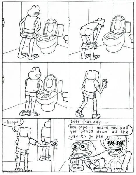 与其他人爱发抖音一样,Matt常常把漫画发到社交平台上。其中一篇漫画讲到PEPE总在三急时把裤子一撸到底,朋友问到时,PEPE回答“这样很爽啊(Feels Good Man)”