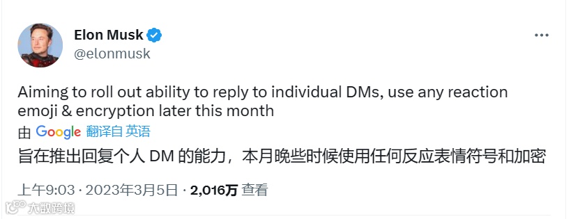 3 月 5 日,埃隆·马斯克发布推文表示:本月晚些时候推特将致力于实现个人加密聊天,并支持使用任何emoji表情。