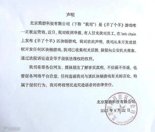 9月27日,针对网友提供的区块链游戏《羊了个羊》游戏截图,《羊了个羊》游戏运营商北京简游科技有限公司发表声明称从未开发或授权开发任何区块链游戏,目前已收集相关证据,并保留报案和诉讼权利。