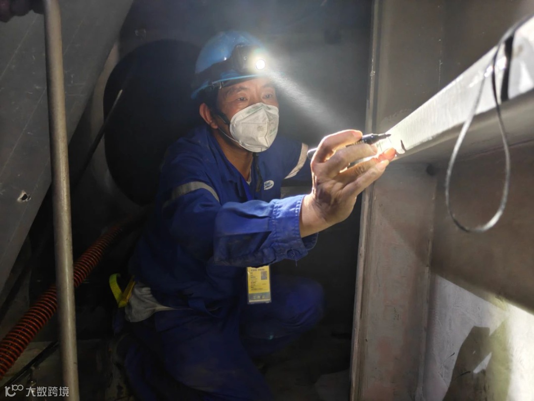 10:00,涂装部打磨组组长邵幼林对25900DWT不锈钢化学品船1号船2#左压载舱进行施工质量互检。