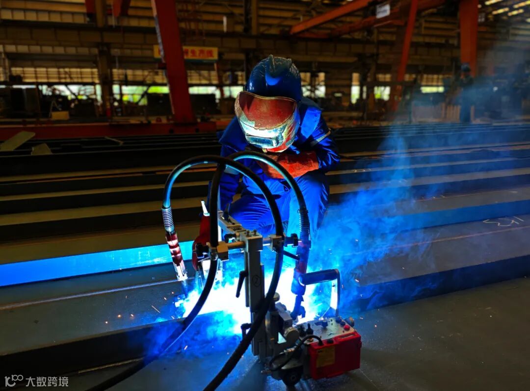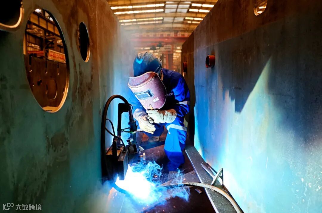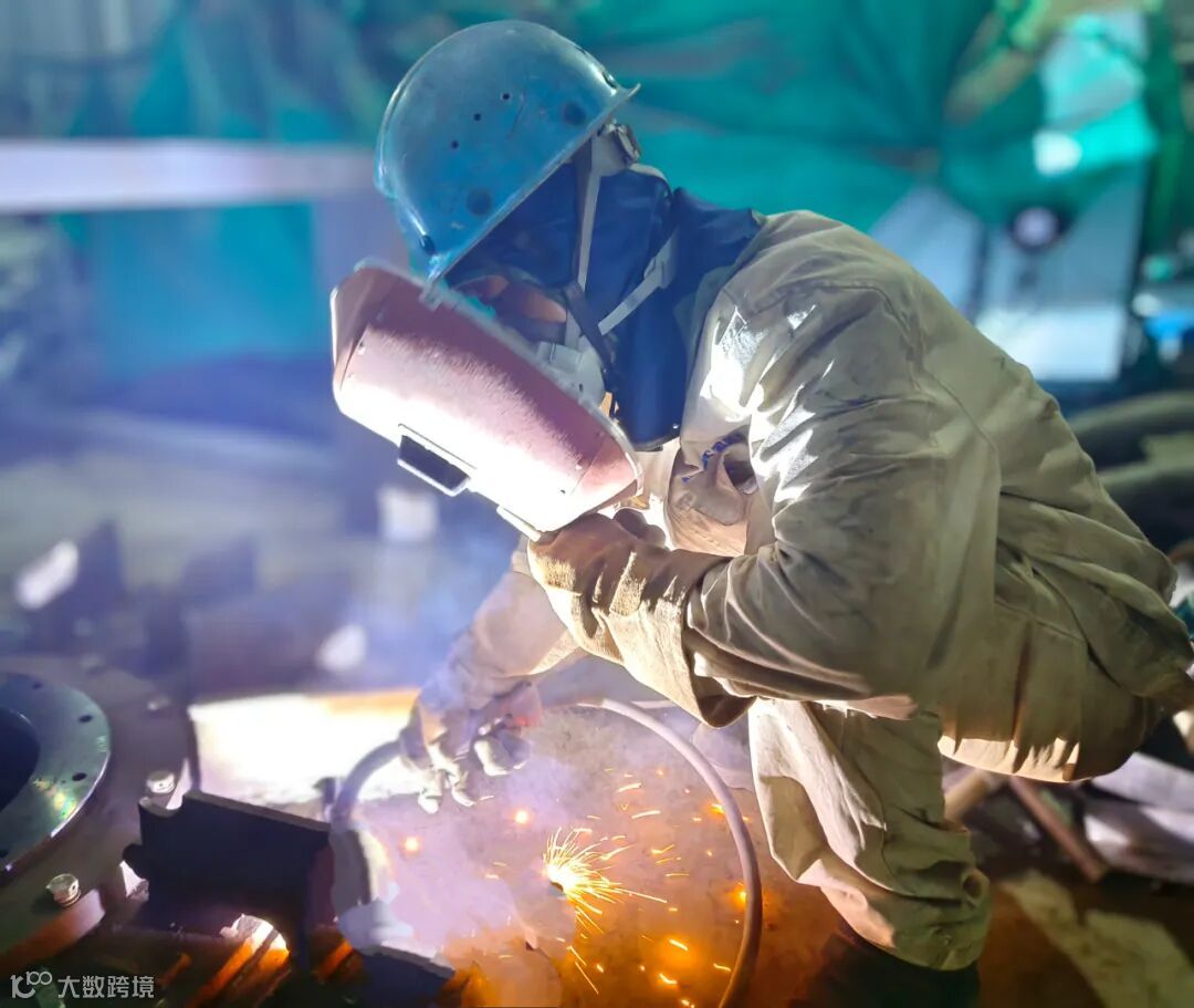 19:00,分段部电焊工林红艳正对RORO风帆助力船2号船分段部件进行焊接工作。