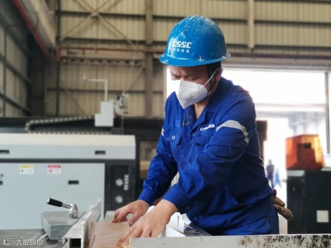 11:50,船艇公司船舶木塑工詹小念正在对船舶内装板进行美化加工和安装工作。