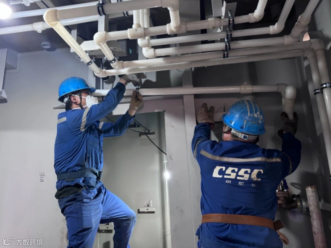 17:00,总装部船舶管系工刘洋和夏正飞正在对18500DWT油化船4号船进行上建总组PE管安装。