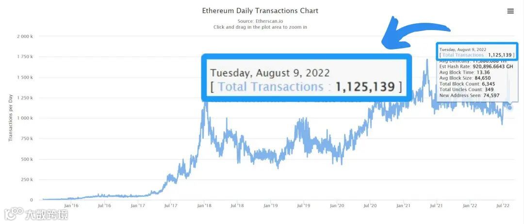 据数字经济学家估计,目前以太坊挖矿每年将消耗44.5太瓦时,约等于荷兰国家一整年的电量消耗。以太坊一笔交易的耗电量就超过了一个美国家庭平均一天的用电量。据以太坊官网显示,以太坊全球正在运行的节点有9728个,仅2022年8月9号一天,以太坊就有112万笔交易被写进区块链。