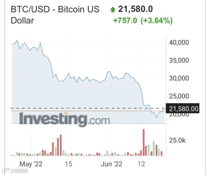 事实上,经历暴跌浩劫的不仅是比特币,多种加密货币都不乐观。如,第二大加密货币——以太坊在6月18日跌破1000美元,回到了“三位数”时代,最低触及880美元。市值曾高达410亿美元的luna币,此前也出现跳水式贬值,价格从近90美元跌至不足0.0001美元。