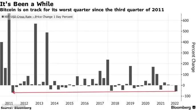 全球央行鹰派抬头与一系列备受关注的加密货币市场暴雷事件持续打击着投资者市场情绪。也正因如此,比特币有望迎来十多年来表现最糟糕的季度。