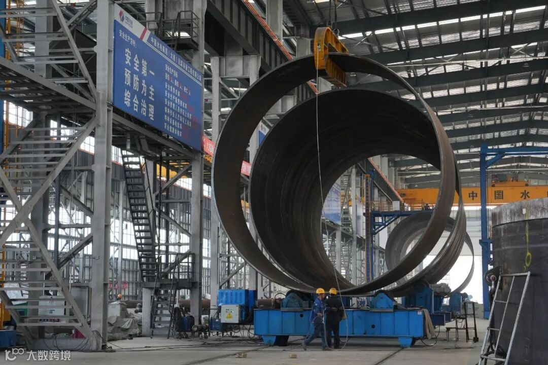 在中水四局(大连)能源装备工程有限公司的塔筒制造生产车间内,焊花飞溅,工人们正在熟练地进行拼板、下料、卷圆等工作。