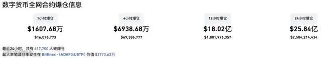 数据显示,截至12月4日晚8时,过去24小时内,共有41.7万人爆仓,数字货币全网合约爆仓金额达到了25.84亿美元。其中,光是比特币24小时内的爆仓金额就超过10亿美元。