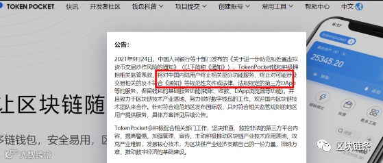 除了火币禁止,一款去中心化钱包TP也发布公告称: