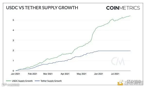 usdc的供应量从2021年年初的约40亿美元增长到超过260亿美元。5 月加密货币大跌后,USDC的增长开始加速——自5月11日以来,USDC的总供应量增加了约75%。Tether (USDT) 仍然是稳定币市场的主导者,总供应量超过640亿美元,但自5月以来USDT增长趋于平缓。USDC是仅次于Tether的第二大稳定币,其在稳定币总供应量中的份额正在增长。