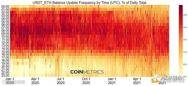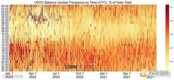 相比之下,USDC的活动往往遵循美国市场时间,尽管它的分布稍微更加分散。大多数日常活动往往在UTC14:00到22:00之间(美国股市在UTC 14:30开盘并在UTC21:00 收盘)。