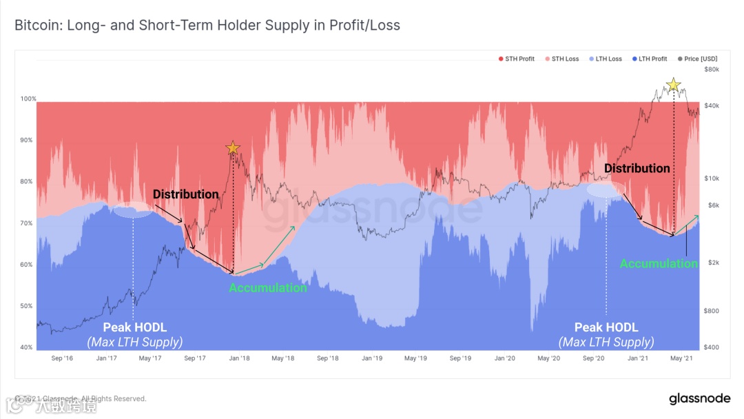在达到“峰值 HODL”(最大 LTH 供应量)后,两个周期都显示了宏观分配事件,因为 BTC 财富从长期持有者转移到短期持有者。在达到顶部后,我们开始看到相反的效果,长期持有者停止支出并开始重新积累,尽管他们的代币经常陷入未实现的损失。